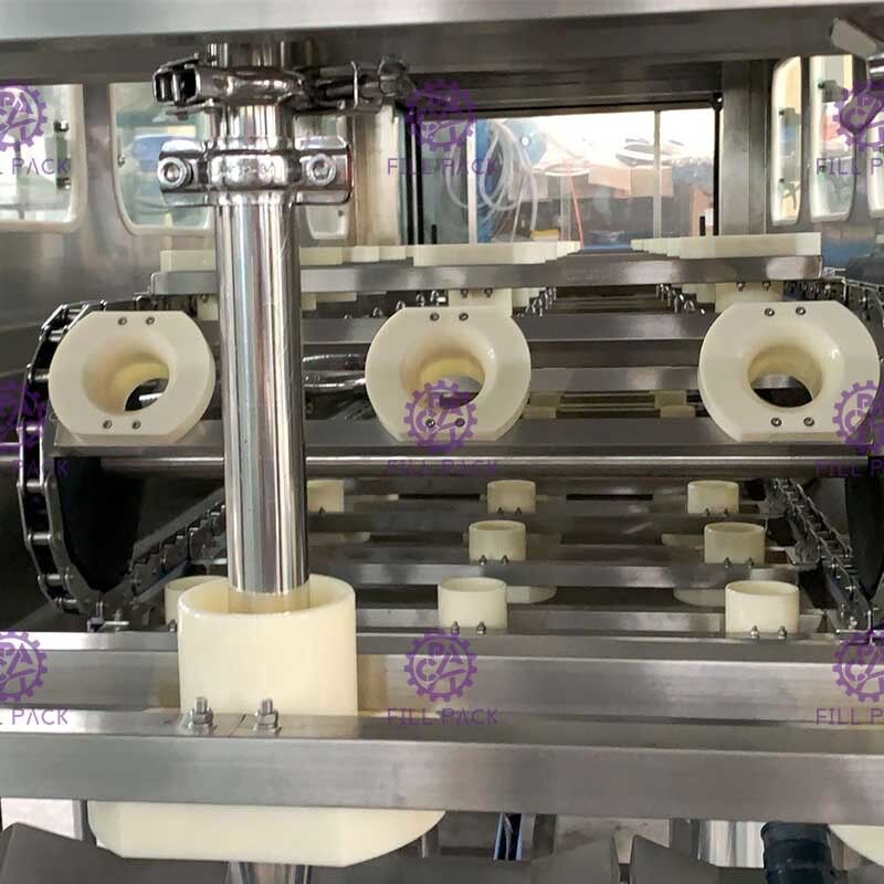 Le seau nettoyé est tourné de 90 degrés avec le mouvement de la chaîne, le seau vide est tiré de la base du seau par le cylindre du seau et tourné vers le bas avec le support du seau,et puis le seau est retourné à l'envers par le cylindre poussant pour mettre le seau vide dans le remplissage en attendant le remplissage sur le convoyeur de la machine.