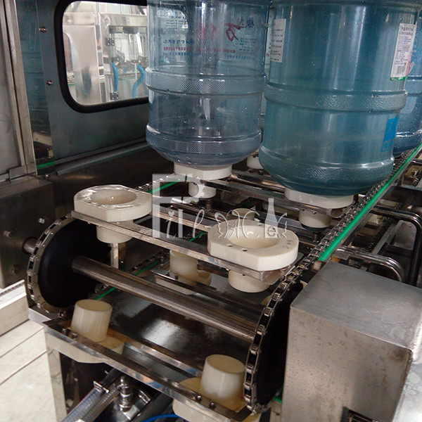 la machine de remplissage de l'eau de bouteille de 5 gallons peut être divisée en 3 étapes : lavant, remplissant et couvrant, les postes de travail du total 36, processus fonctionnant en tant que ci-dessous :