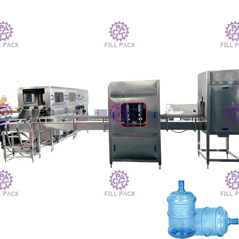 L'usine de mise en bouteille d'eau de gallon comprend un décapteur et une machine à laver semi-automatique, un rinceur-remplisseur-capteur monobloc, un convoyeur à rouleaux, un tunnel de rétrécissement d'étiquettes, un voyant de vérification, une machine de codage à rouleaux d'encre solide