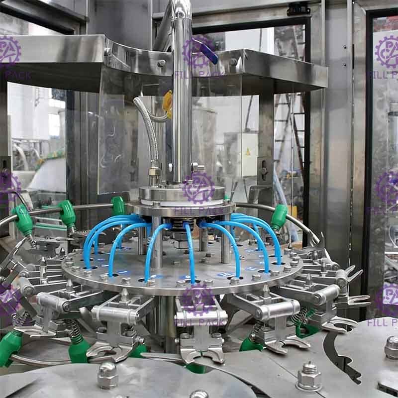 Des pinces à ressort sont utilisées dans le processus de lavage des bouteilles. Les bouteilles vides peuvent être retournées à 180° le long du rail de convoyage. Il y a deux fois de lavage interne et externe, l'efficacité du lavage des bouteilles est élevée. Le remplissage par une soupape de remplissage contrôlant le niveau de liquide de type ressort, sans égouttement. Le niveau de liquide est facile à contrôler. Toute la construction est en SUS304, il n'y a pas d'angle mort à l'intérieur de la soupape de remplissage. Le couple magnétique est utilisé pour le bouchage à vis. La puissance du bouchage à vis peut être ajustée sans paliers. La puissance du bouchage à vis peut également être fixée, et les bouchons ne seront pas endommagés, le bouchage est fiable. L'ensemble de la machine est contrôlé par un automate avec écran tactile comme interface homme-machine. La quantité de boissons dans le réservoir de stockage peut être contrôlée automatiquement. Le remplissage et le bouchage s'arrêteront automatiquement en l'absence de bouteille. Lorsque les bouteilles sont mal serrées ou lorsque les bouchons ne sont pas disponibles, la machine peut s'arrêter automatiquement. La technologie de changement de fréquence est utilisée pour ajuster la vitesse de fonctionnement sans arrêt. La capacité de production peut être affichée numériquement et peut être ajustée facilement.